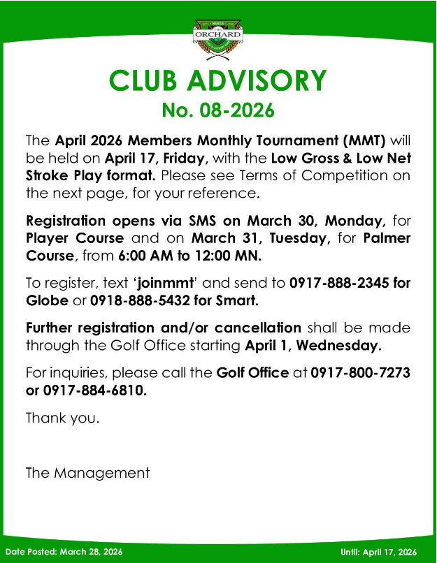 The Orchard is distinguished by two world-class championship courses, The Arnold Palmer Course and the Gary Player Course. Both have hosted international and national competitions, (1995 Johnnie Walker Classic, The 1996 World Golf Tour), and professional and amateur tournaments (The Philippine Amateur Matchplay Championships, Philippine Professional Tour events, etc).