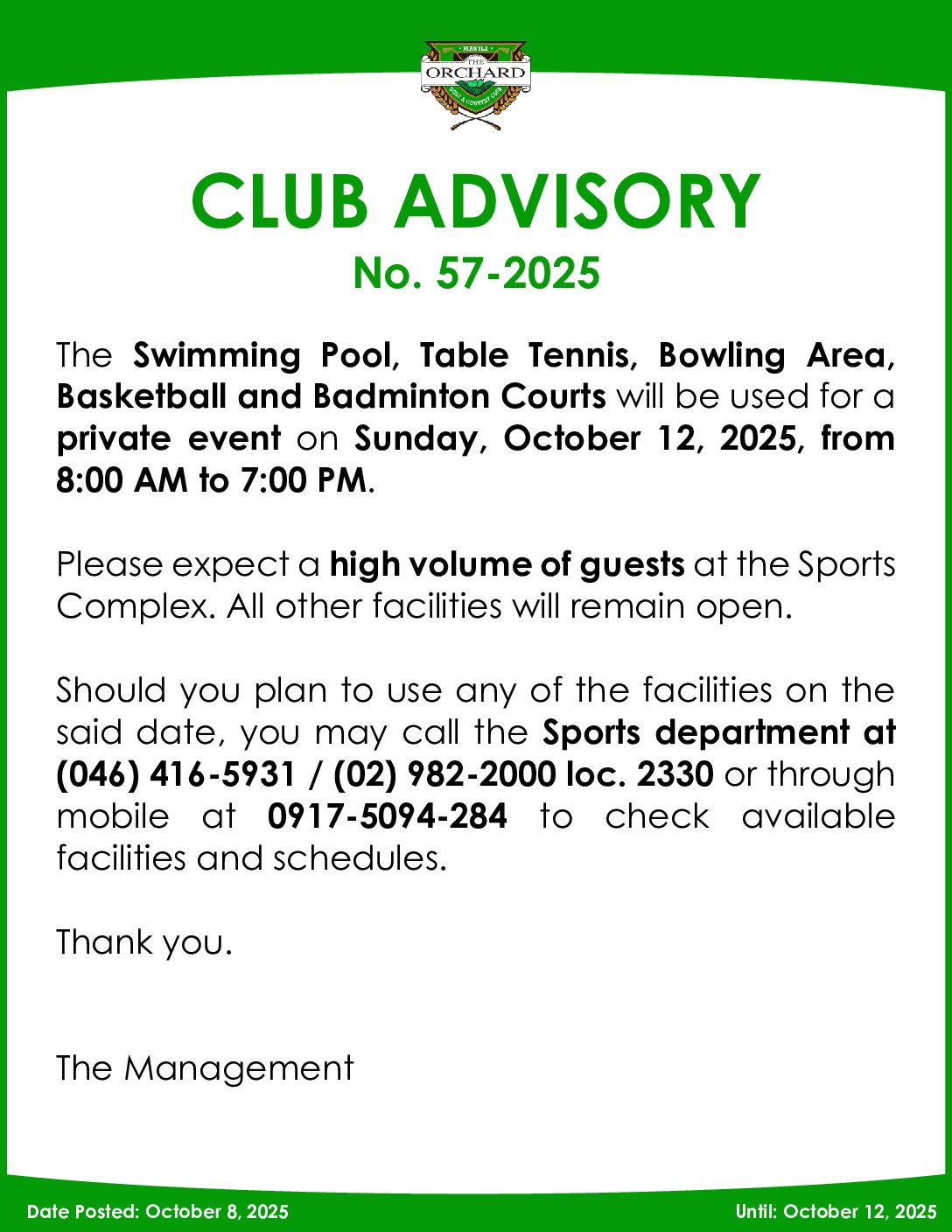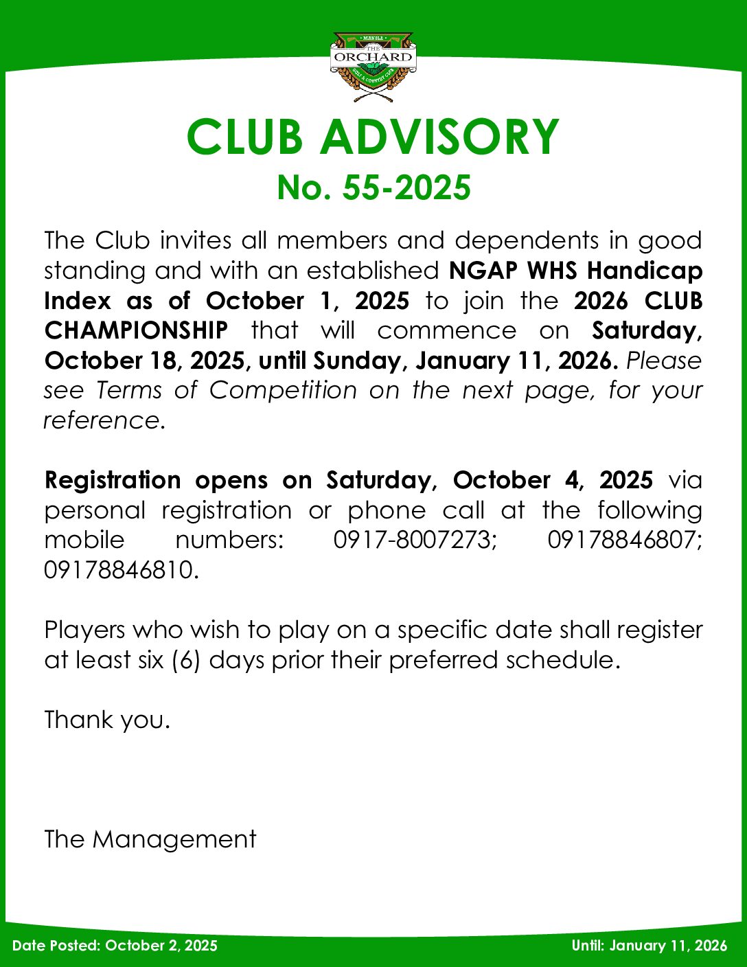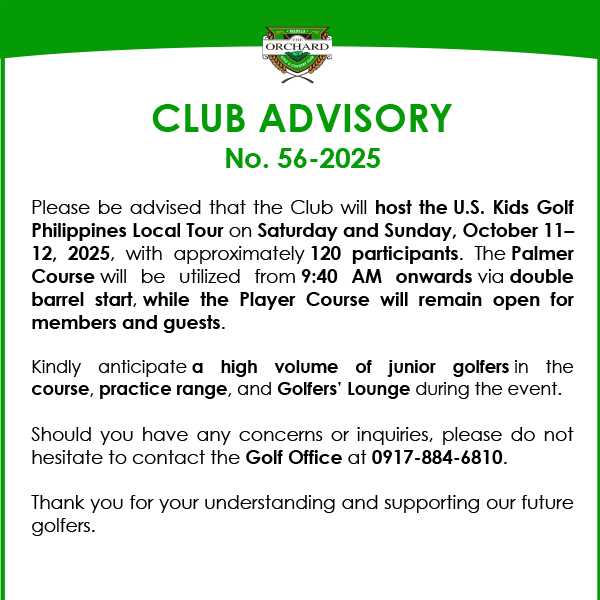 Annual Shareholders Meeting and Election 2024 Click to Download the PDF Corporate Assignee Corporate Nominee Assignment of Playing Rights Individual Share Member’s Handbook Lifetime Membership Requirements Advisory Lifetime Membership Program Corporate Share 1st Degree of Consanguinity Transfer of Individual Share to Heir Transfer of Individual Share to Corporate Entity Honorary Member Board Risk Oversight Committee Charter Integrated Annual Corporate Governance Report Notice of Meeting Proxy Form 2024 ASME Minutes 2024 ASME Guidelines 2024 Definitive IS 2024 2024 ASME Registration Form Announcement Club Advisory No. 56-2025 October 8, 2025 Club Advisory No. 55-2025 – Club Championship October 2, 2025 Club Advisory No. 54-2025 OCT MMT October 2, 2025 Club Advisory No. 53-2025 October 1, 2025 ASME 2024 Click for more photos